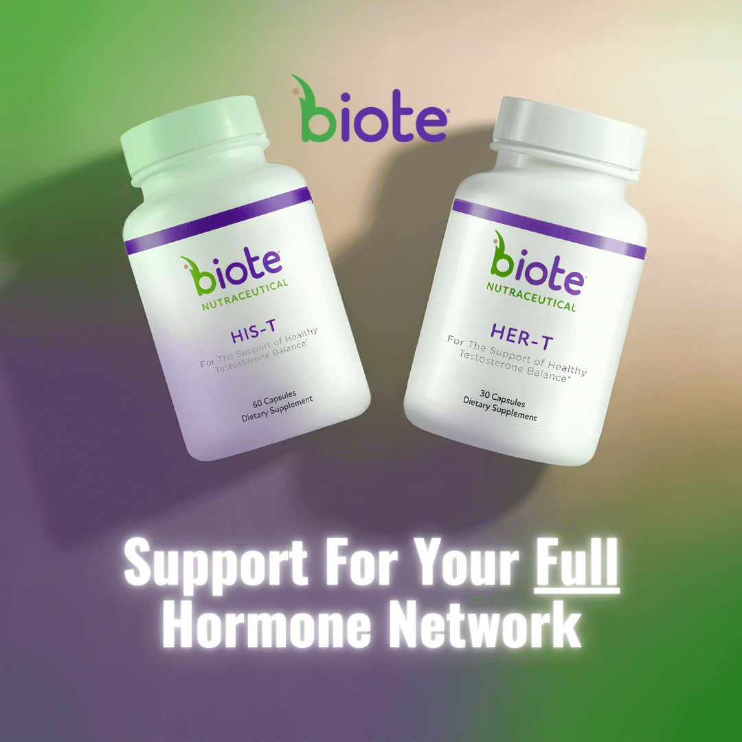 Her-T, a new nutraceutical from Biote, was developed to support healthy testosterone balance for women. This new formulation also seeks to help balance cortisol levels, support nitric oxide production – which supports vascular and sexual health – and support health and longevity.*